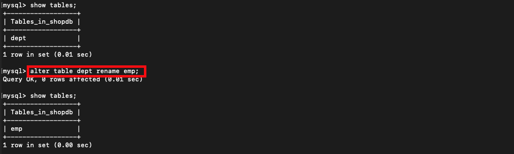 ▼ 우선 ALTER를 이용해서 테이블 이름을 변경시켜보겠습니다. (예: shopdb 데이터베이스의 dept 테이블을 emp 테이블로 변경해보겠습니다.)