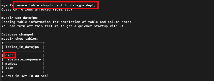 마지막으로 테이블을 다른 데이터베이스의 테이블로 이동시켜보겠습니다. (예: shopdb의 테이블을 datajpa 테이블로 동일한 이름인 dept로 이동)