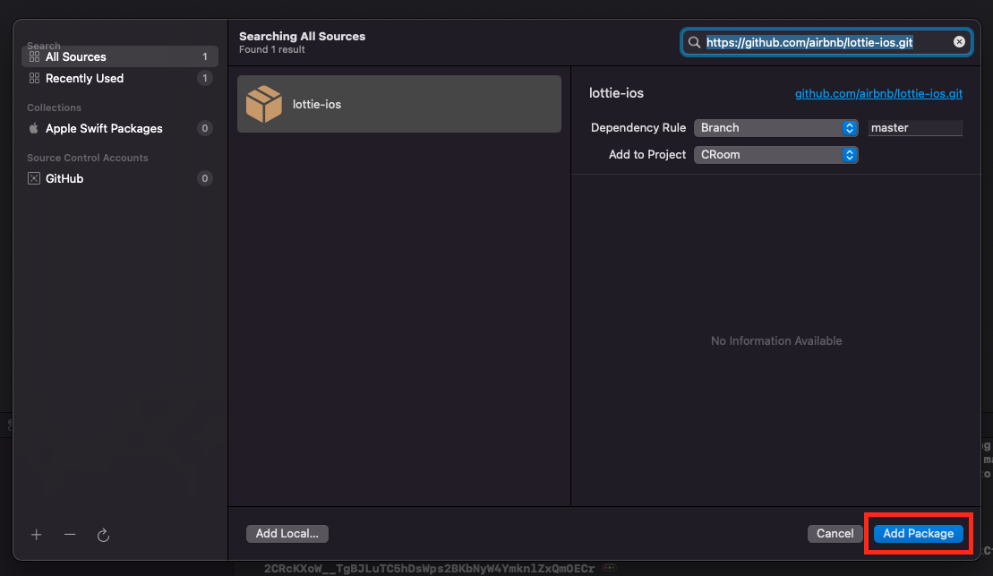 ▼ 우측 상단에 검색창에 복사한 주소를 넣고 엔터를 치면 lottie-ios 패키지를 찾을 수 있습니다. 우측 하단에 Add Package 버튼을 눌러 패키지를 추가합니다.