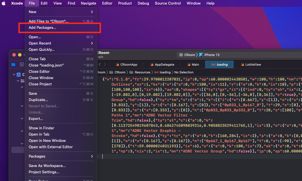 ▼ Xcode의 File -> Add Packages... 메뉴를 통해 새로운 패키지를 추가합니다.