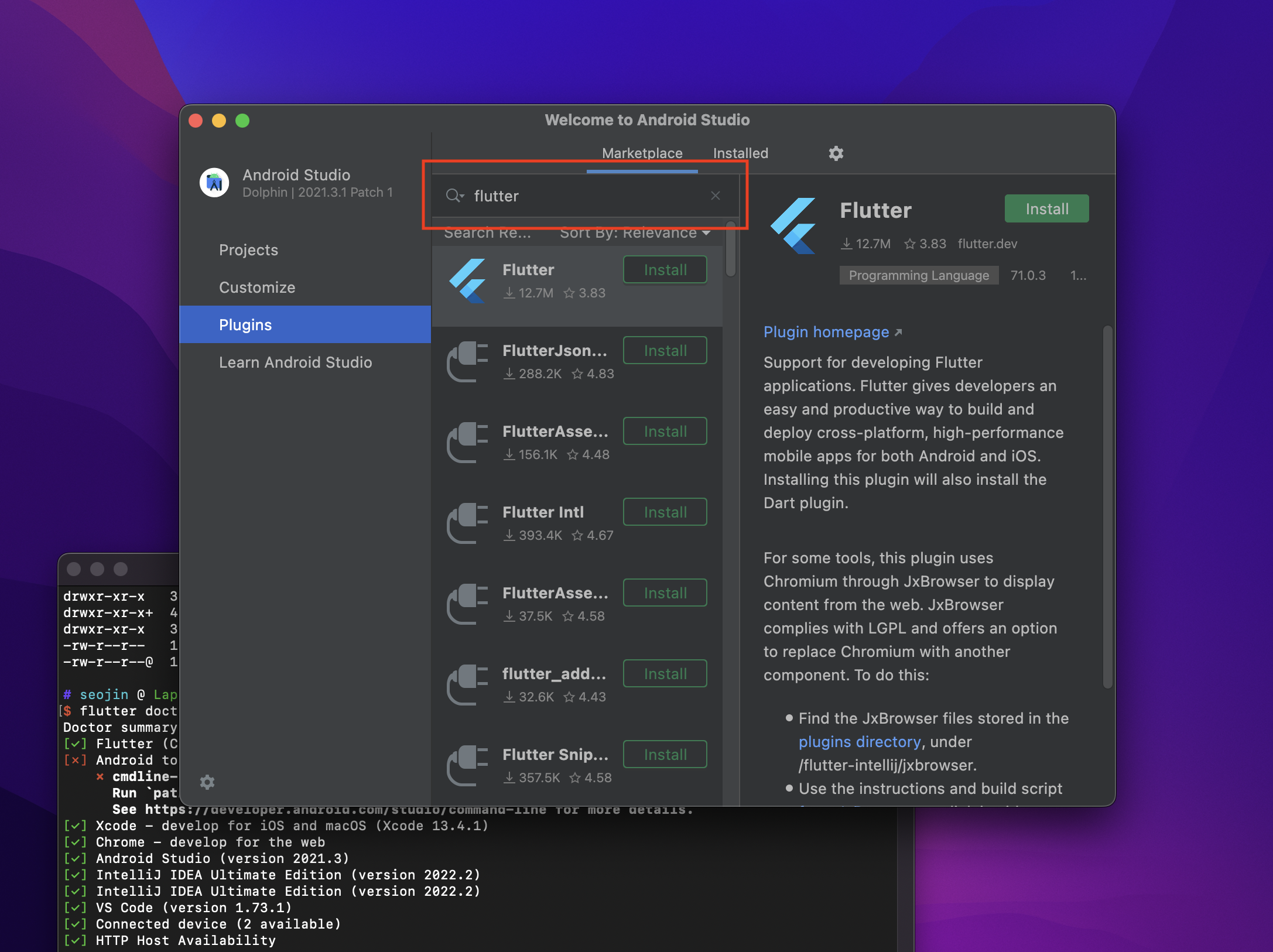 ▼ flutter를 검색해 최상단에 있는 Flutter 플러그인을 install 버튼을 눌러 인스톨합니다.