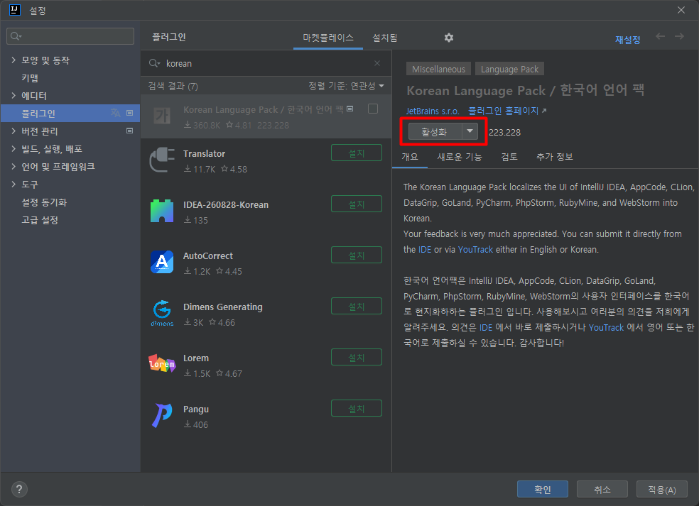[intelliJ] 인텔리제이 한글 언어팩 설치하기 및 비활성화 제거