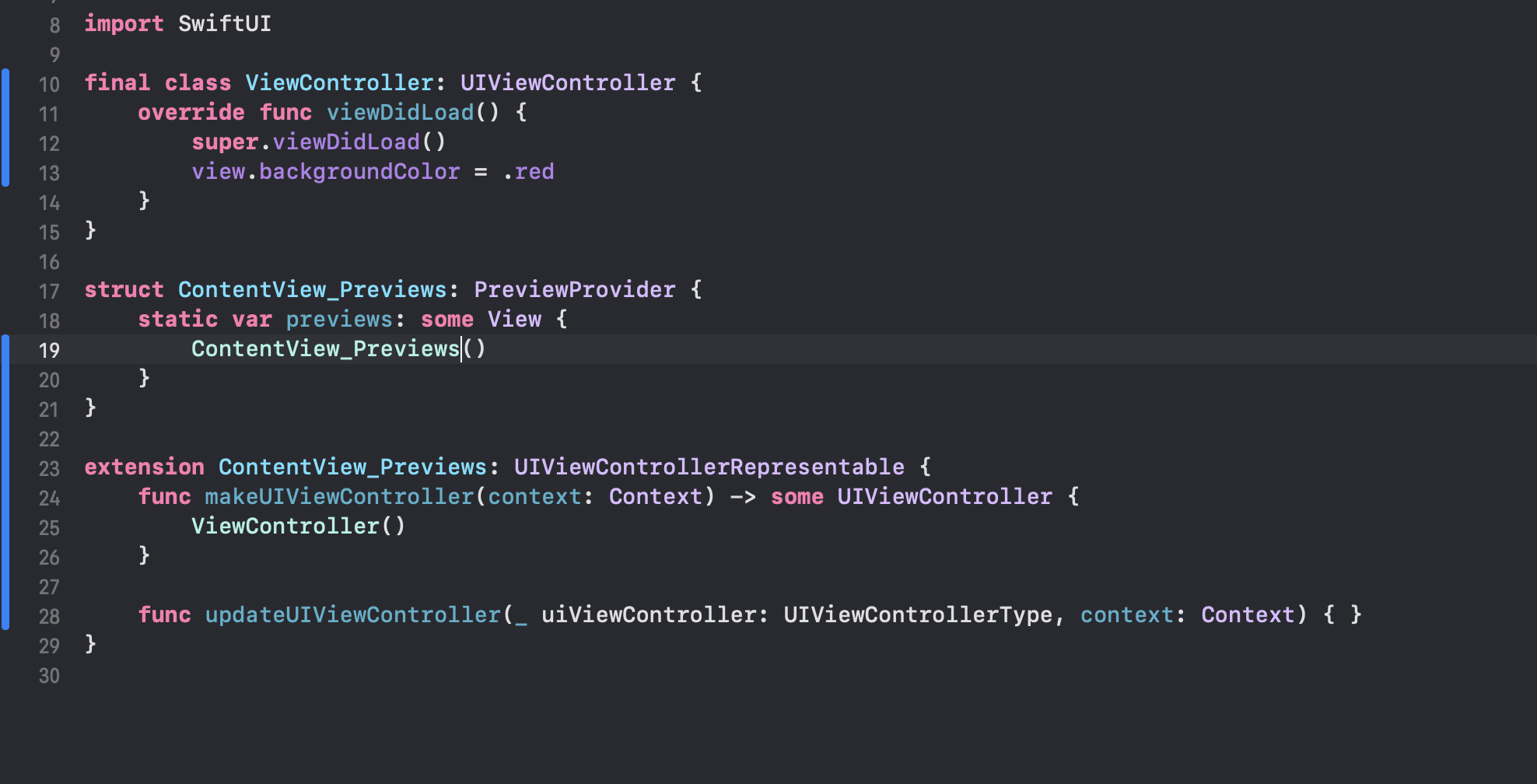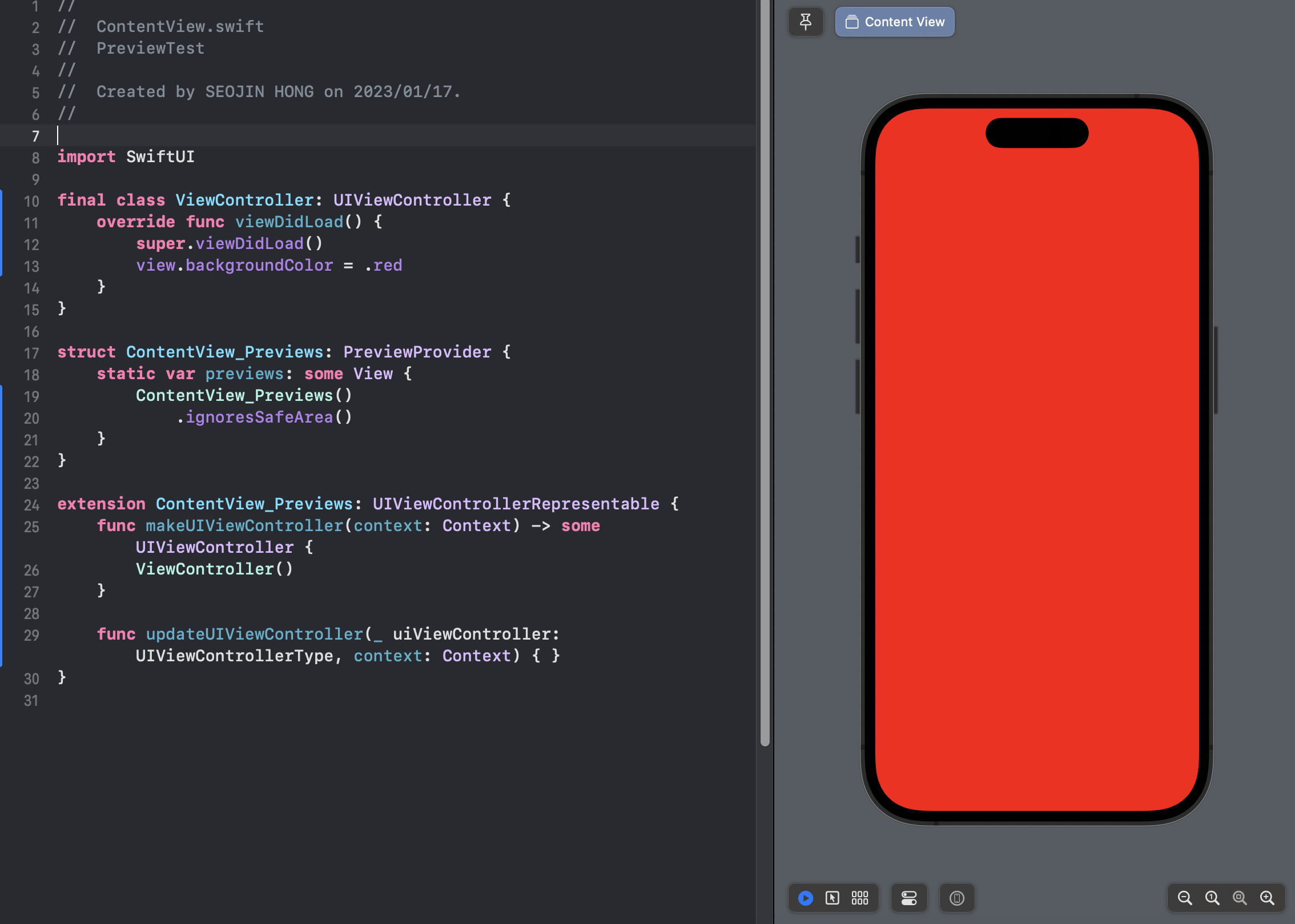 ▼ 이제 그냥 preview에서 ContentView_Previews()만 반환해줍니다. ContentView_Previews가 UIViewControllerRepresentable을 구현하고 UIViewController를 감싼 구조가 됩니다.