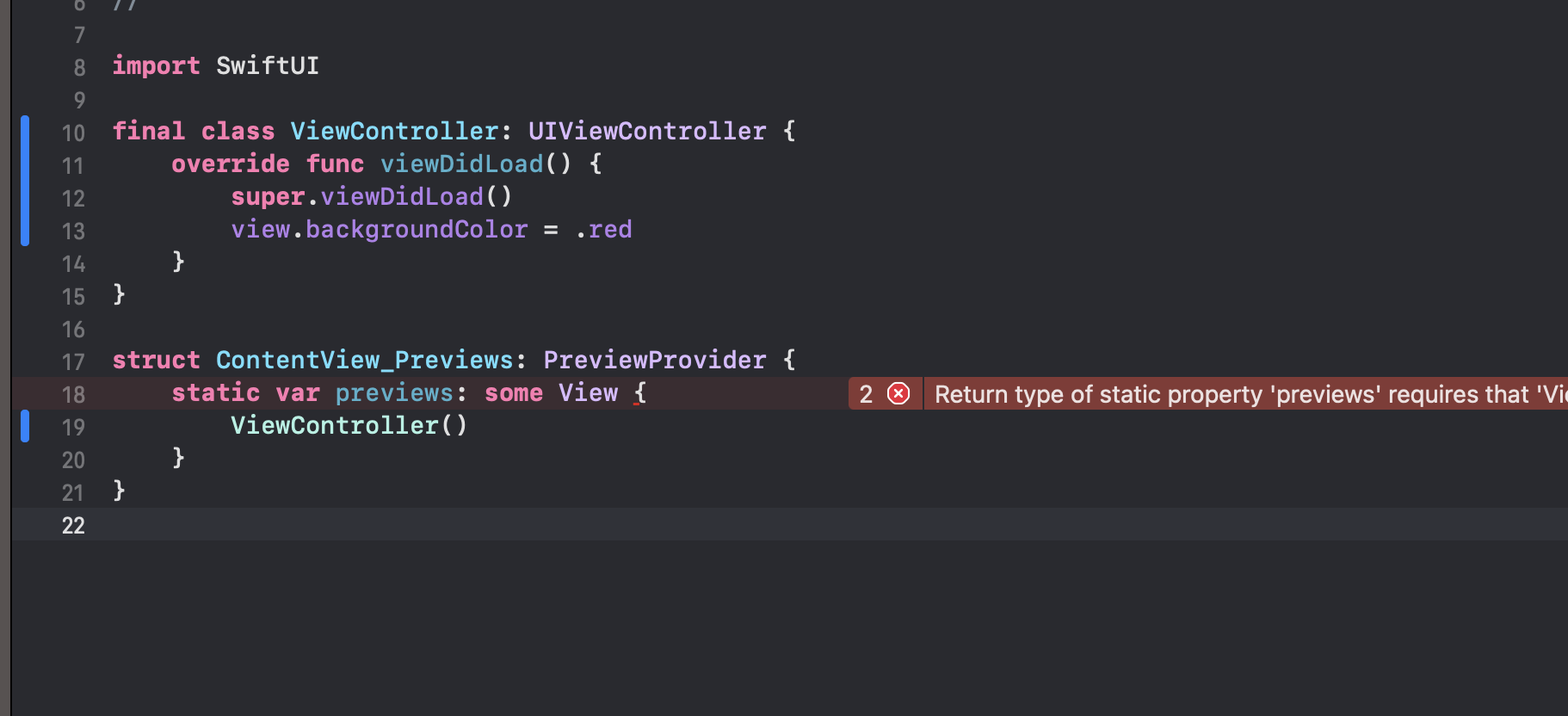 ▼ 다음과 같이 ViewController를 하나 생성합니다. 만약 PreviewProvider 프로토콜을 구현한 preivews 반환 값이 View 타입이 아니라면 보시다시피 에러가 납니다. UIKit의 뷰 컨트롤러를 반환하기 때문입니다.