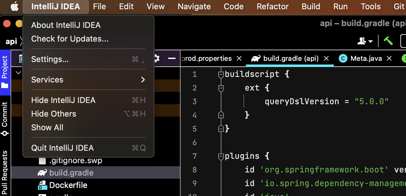 ▼ IntelliJ IDEA 툴에서 Settings... 메뉴를 선택합니다. 윈도우의 경우 File > Settings 입니다.
