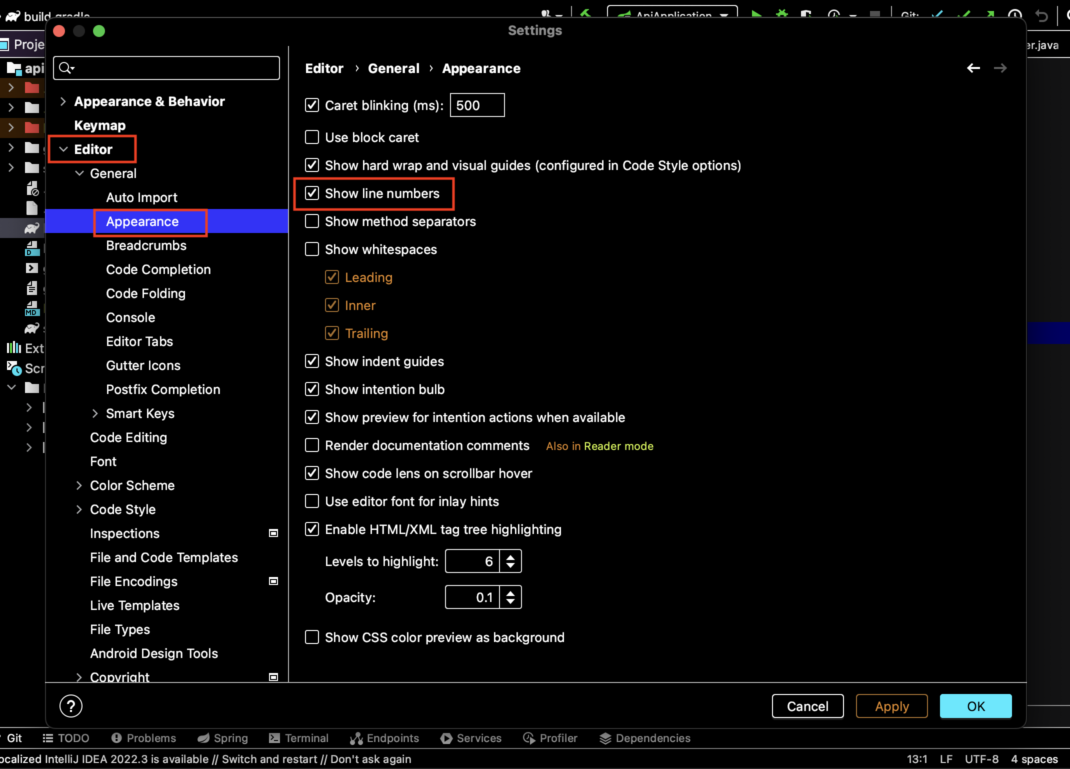 ▼ 다음으로 Editor > Appearance 메뉴를 선택합니다. 해당 메뉴 옵션중에 Show line numbers의 체크박스를 활성화 합니다.